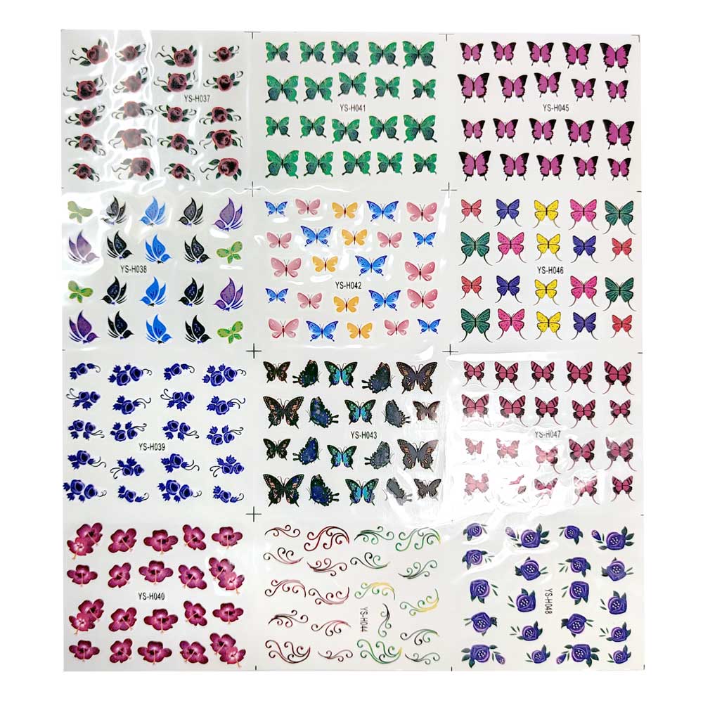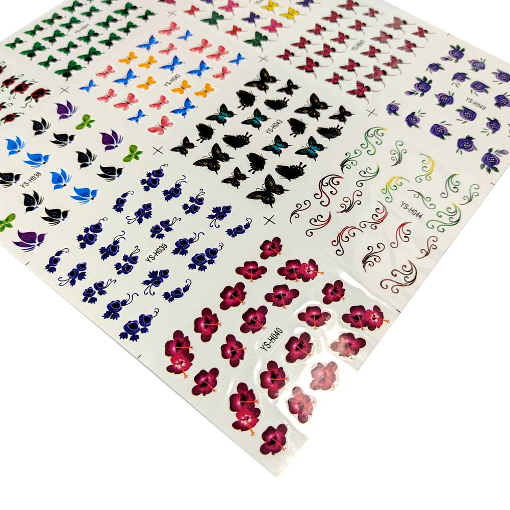 Cartela com diversos desenhos em adesivos para decorar as unhas, deixando-as delicadas e e charmosas.