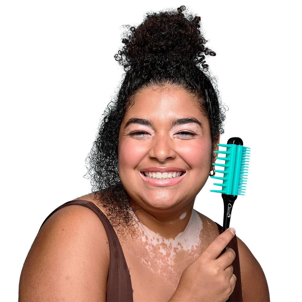 Desfaz nós, alinha os fios e modela os cachos com precisão.
